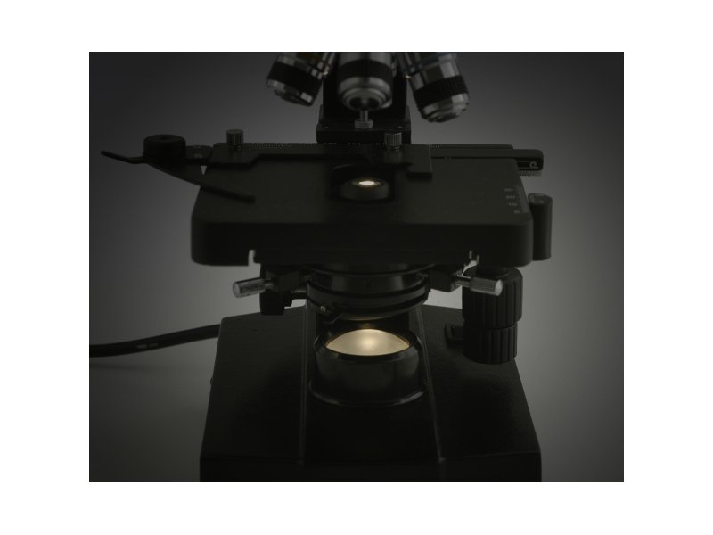 Mikroskop Levenhuk D320L jest wyposażony we wbudowane oświetlenie z możliwością regulacji jasności. Pozostałe cechy: Immersja, dwusoczewkowy kondensor Abbego 1,25, cztery obiektywy achromatyczne.