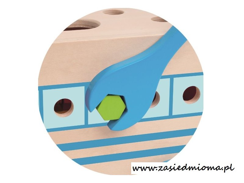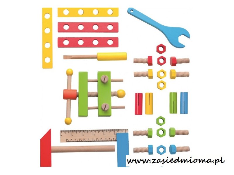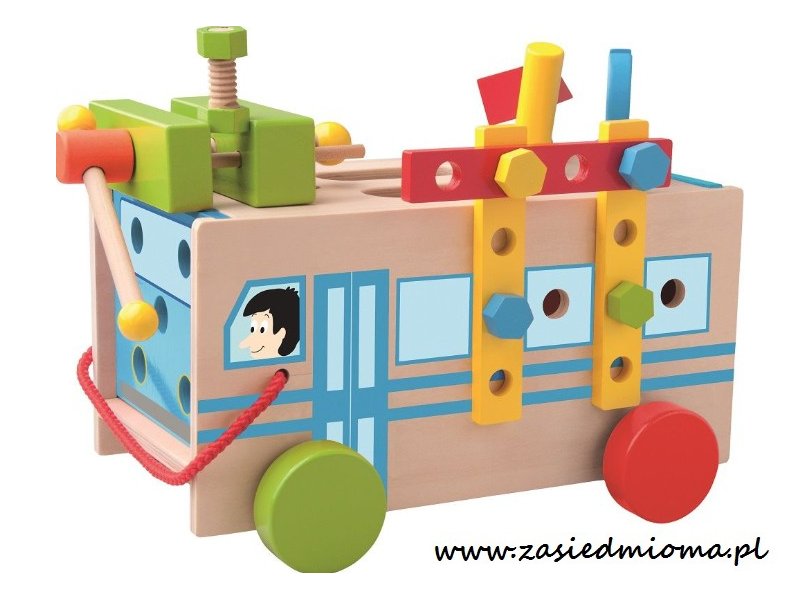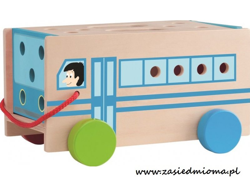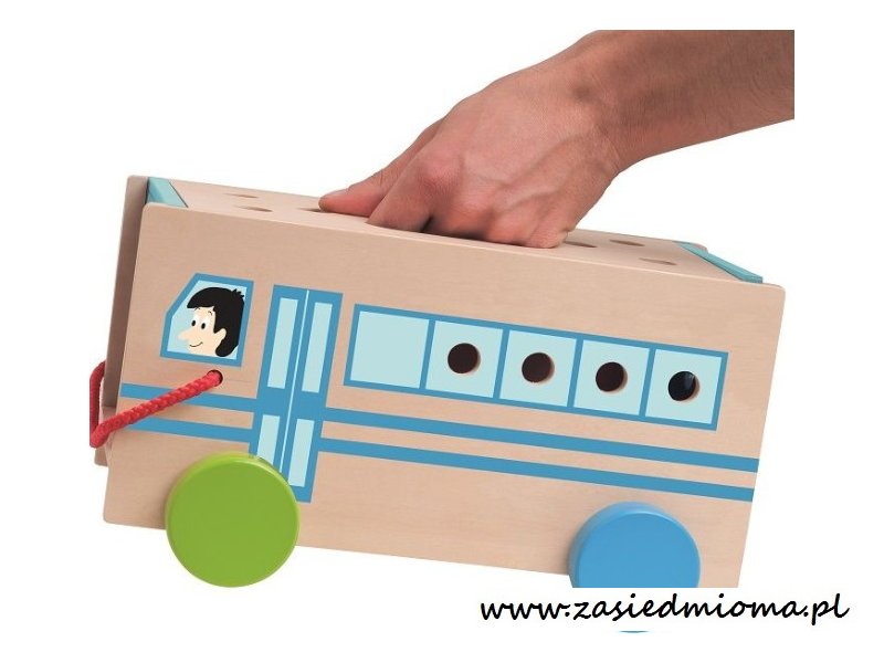 Całość wykonana z drewna i sznureczka do ciągnięcia. Autobus ma na górze i po bokach otwory, więc można go traktować jako bazę do wkręcania śrubek i przybijania gwoździ. Również na dachu wygodny uchwyt do przenoszenia całości.