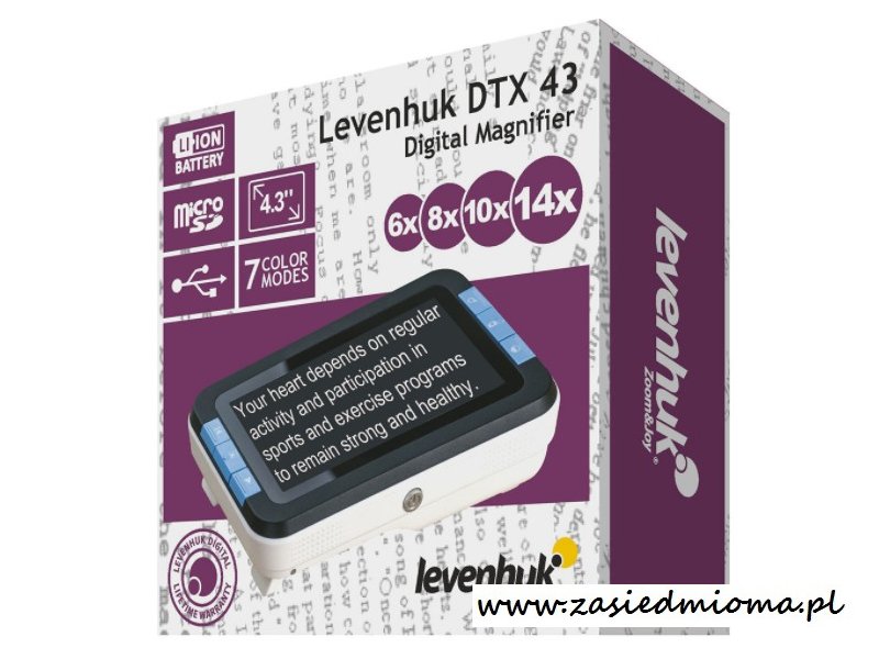 Lupa cyfrowa Levenhuk DTX 43 to doskonały wybór do czytania i oglądania małych ilustracji. Ten przyrząd optyczny zapewnia dostęp do czterech poziomów powiększenia i siedmiu trybów koloru dla wyświetlanego tekstu. Po podłączeniu lupy do komputera lub telewizora możesz wykonywać zrzuty ekranu i zapisywać je na karcie pamięci. Lupa może być zasilana przez zasilacz lub baterię. Czas pracy na baterii wynosi 120 minut.