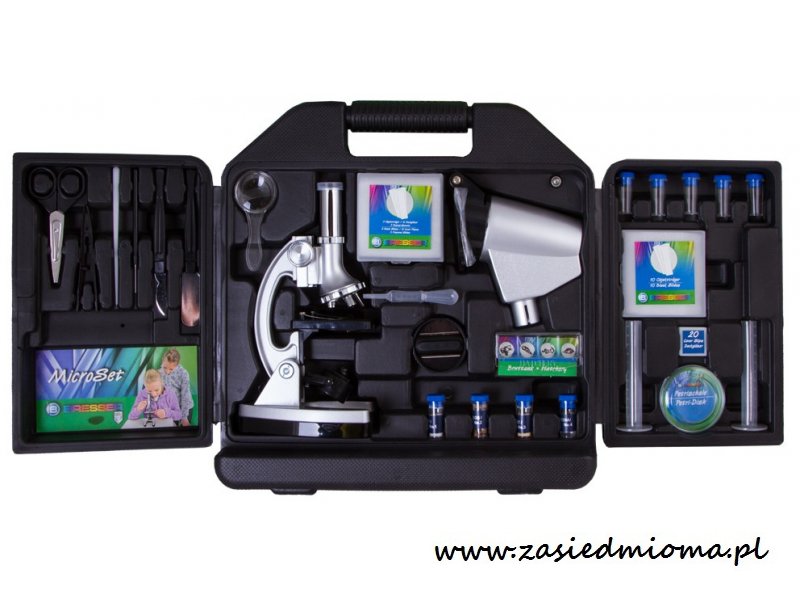 W zestawie znajduje się dużo akcesoriów do przeprowadzania własnych eksperymentów: gotowe preparaty, fiolki z próbkami, różnorodne narzędzia do obserwacji mikroskopowych, a także wylęgarnia artemii. Zestaw i mikroskop są dostarczane w solidnym futerale do przechowywania i transportu, dzięki któremu można wygodnie przewozić je z miejsca na miejsce.
