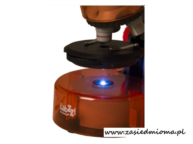 Podczas badania należy umieścić na okrągłym stoliku cienką, przezroczystą próbkę obiektu, na przykład skrzydła muchy lub komórki cebuli. Dzięki wygodnym klipsom próbka będzie dobrze zamocowana i nie wysunie się spod obiektywu przy nieostrożnym trąceniu. Światło emitowane przez diody LED (znajdujące się pod stolikiem) przechodzi przez próbkę i pozwala na uzyskanie powiększonego obrazu. Niezwykle użyteczną funkcją jest regulacja jasności, która umożliwia zwiększenie podświetlenia przy obserwacji grubszych próbek o mniejszej przezroczystości lub zmniejszenie go w przypadku cieńszych, bardziej przezroczystych obiektów.