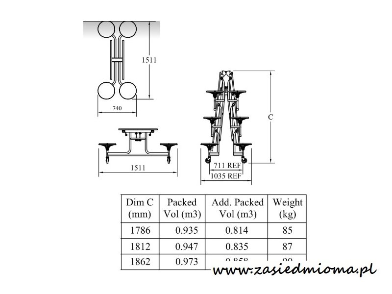 Dostępne wysokości stołu: 66 cm ( wysokość po złożeniu 178,5 cm),
