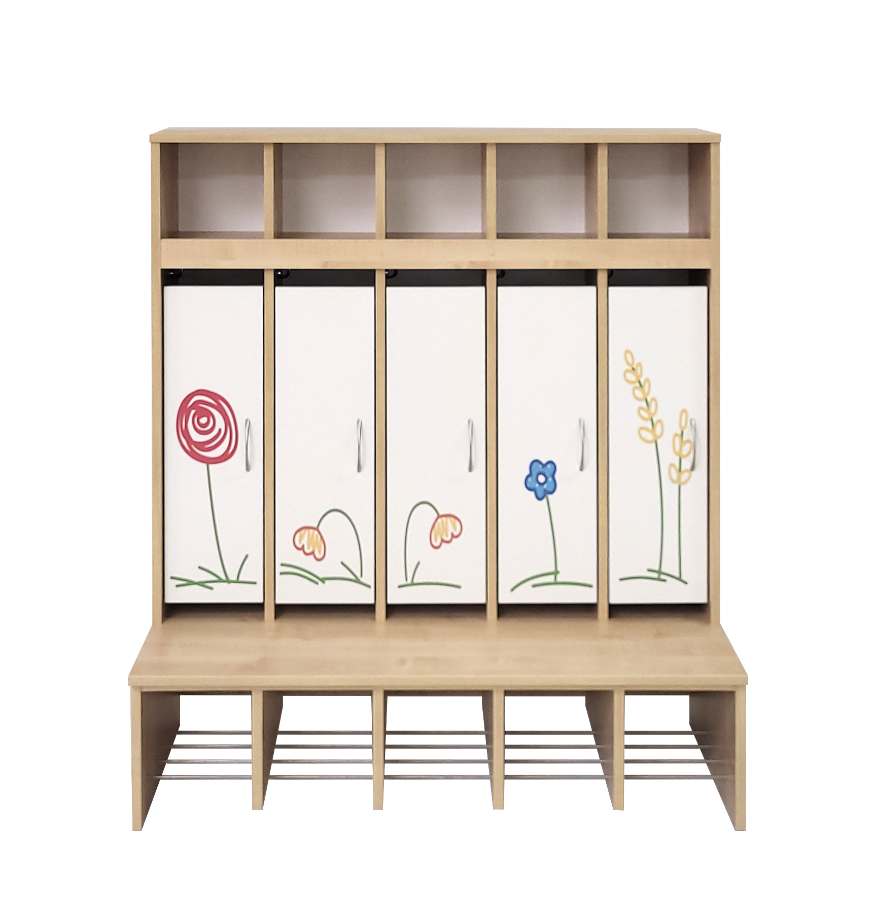 Regał szatniowy wykonany z płyty meblowej laminowanej o gr. 18 mm w standardowym kolorze klon lub biały, fronty w kolorze białym z kolorowymi nadrukami. Krawędzie wykończone listwą PCV. Każde stanowisko ma indywidualną zamykaną przegrodę, w której są podwójne haczyki na kurtkę, w górnej części szatni jest otwarta półka na czapki a w dolnej ażurowy stelaż na obuwie. W dolnej części znajduje się również ławeczka, na której dziecko może swobodnie usiąść i się ubrać.