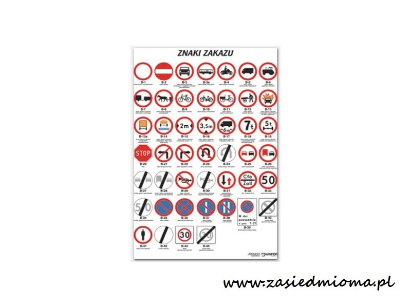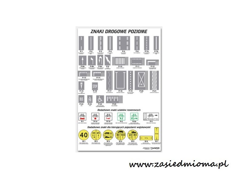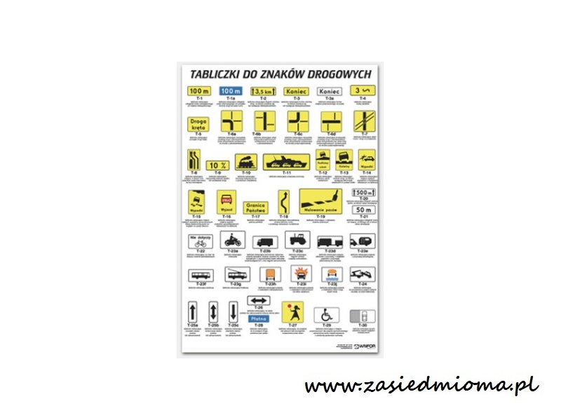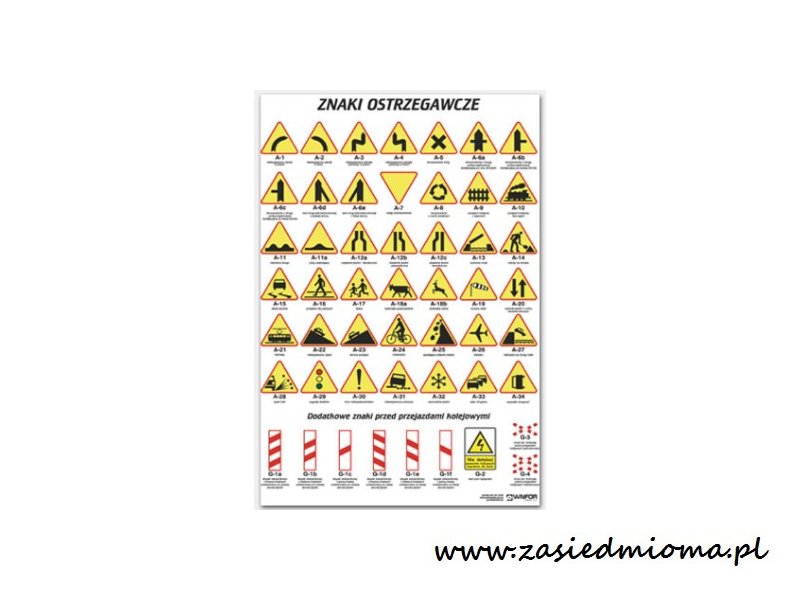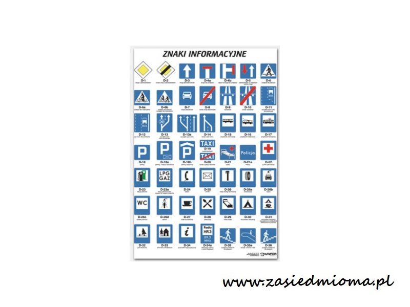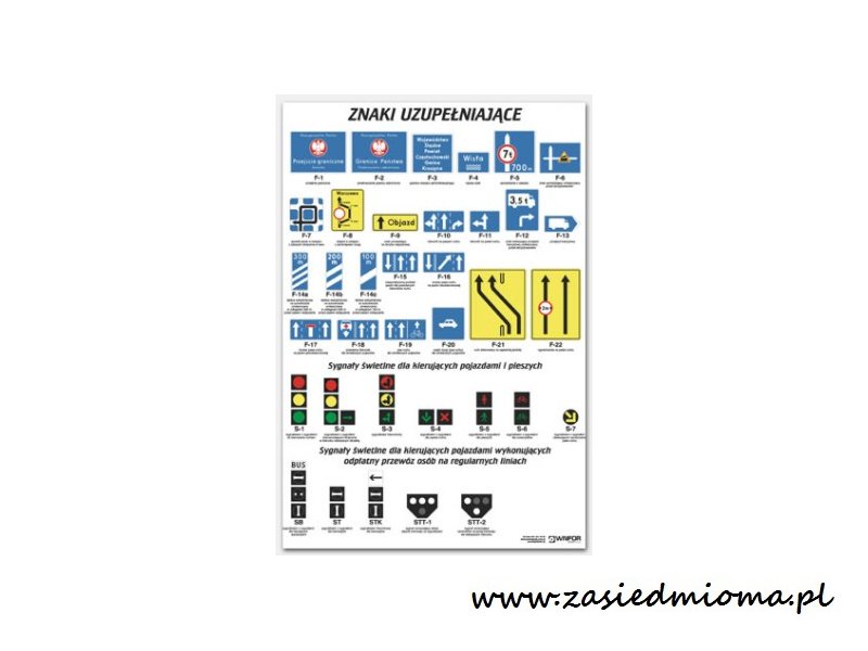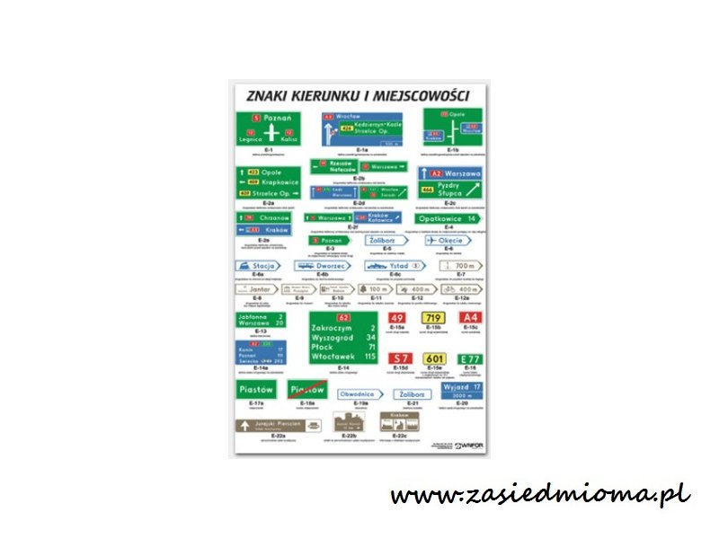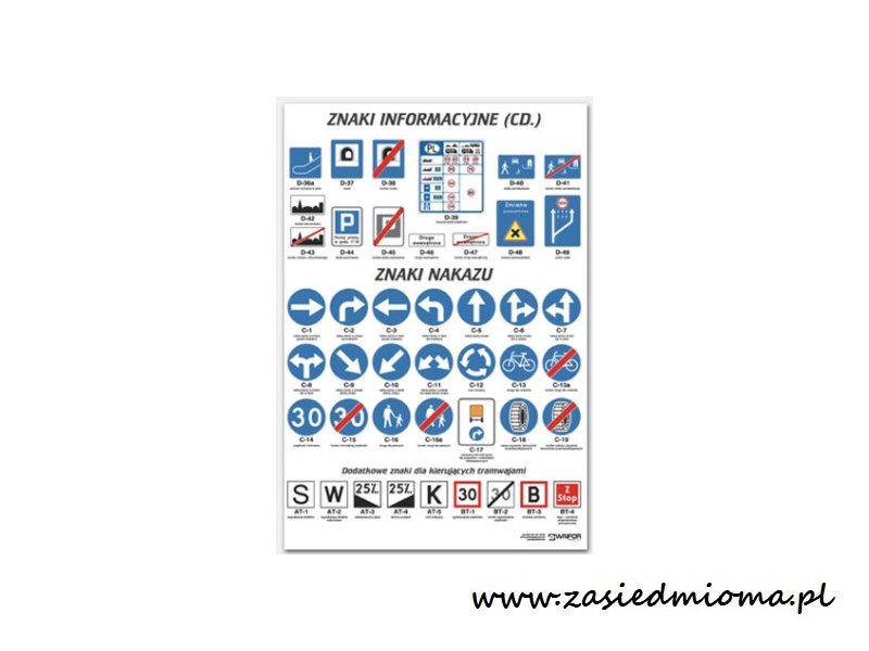 Zestaw ośmiu plansz ze znakami drogowymi przedstawiony wg kategorii: znaki ostrzegawcze, zakazu, nakazu, informacyjne, kierunku i miejscowości, uzupełniające, tabliczki do znaków drogowych, dodatkowe znaki dla kierujących tramwajem, sygnały świetlne dla kierujących pojazdami i pieszych, przed przejazdami kolejowymi, dla szlaków rowerowych, znaki drogowe poziome, sygnały świetlne dla kierujących pojazdami wykonującymi odpłatny przewóz osób na regularnych liniach. Na mniejszej tablicy umieszczono znaki wprowadzone w Dz.U. 170 z 2002 r.