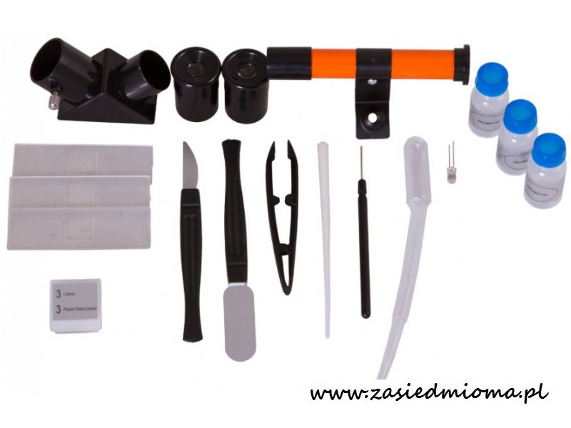 Zestaw zawiera wszystkie narzędzia niezbędne do przygotowywania preparatów mikroskopowych i przeprowadzania ciekawych eksperymentów.