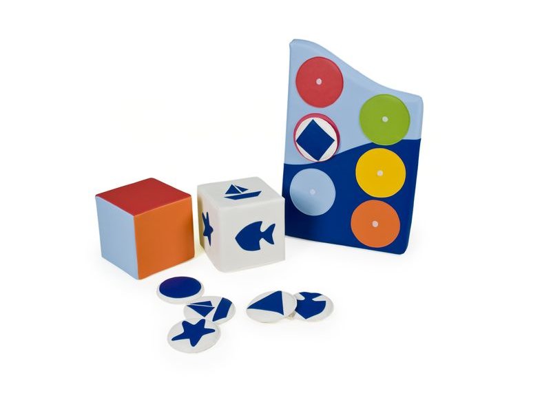 Kostki (25x25x25 cm), rybki i dyski dołączone do zestawu są elementem gier. Te elementy mają różne kolory i funkcje i położenie.